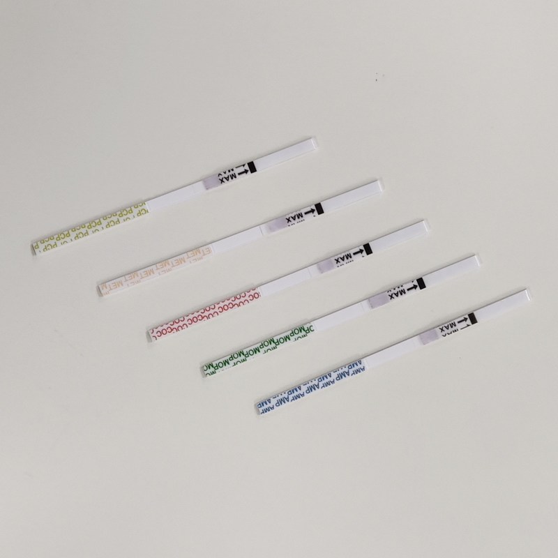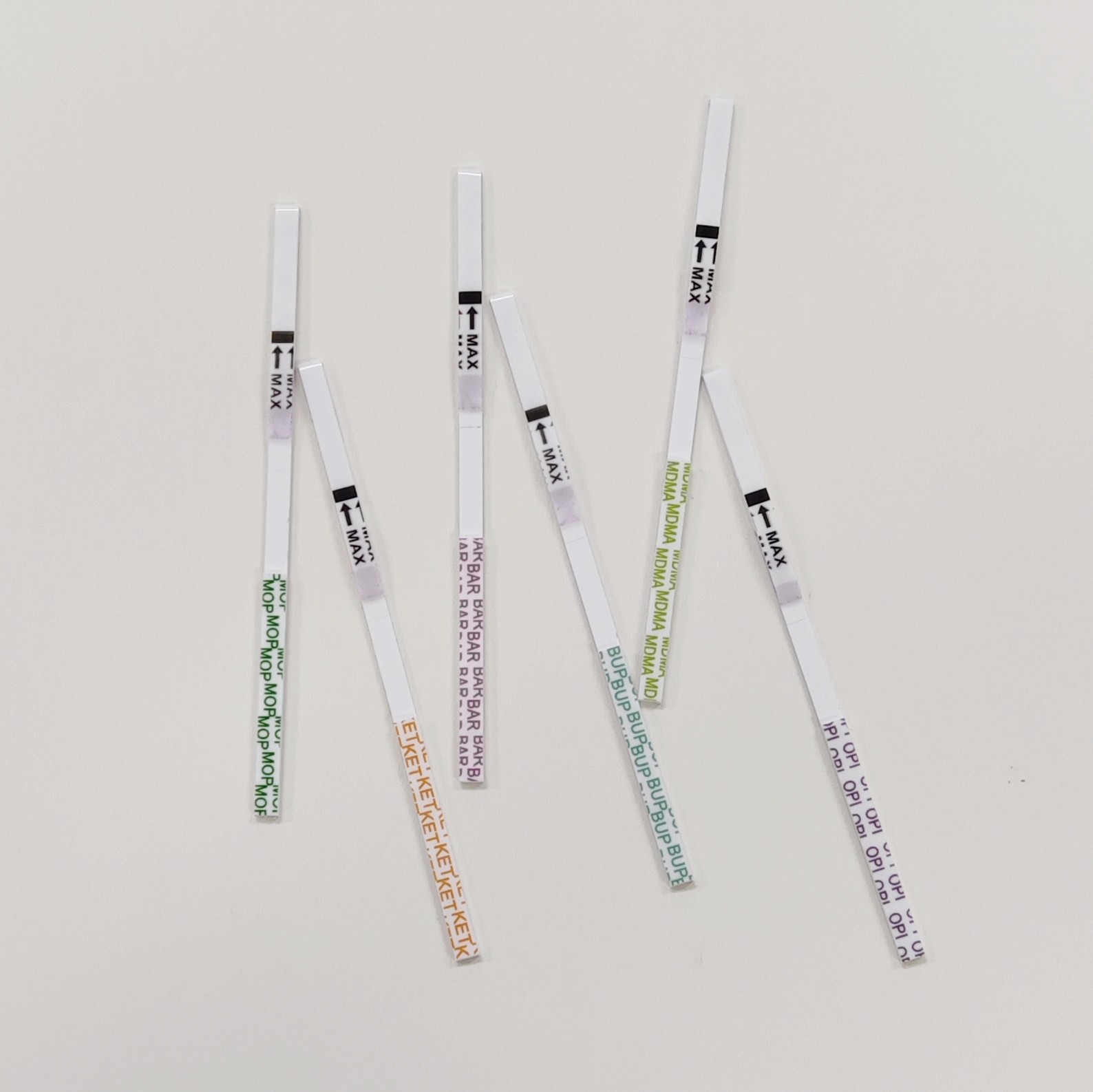Cuando los niveles de fármaco de la muestra son iguales o superiores al nivel de detección de la prueba, el fármaco libre de la muestra se une al conjugado de anticuerpos monoclonales del fármaco correspondiente,evitar que el conjugado de anticuerpos monoclonales del fármaco se une al conjugado de proteínas del fármaco inmovilizado en la región de ensayo (T) del dispositivo.Esto evita el desarrollo de una banda de color distinta en la región de ensayo.