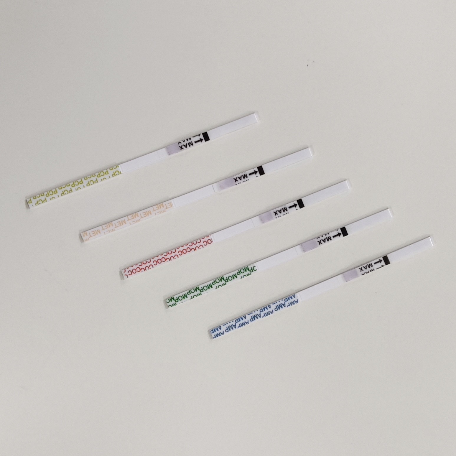 Cuando se activa el ensayo, la orina se absorbe en el ensayo por acción capilar, se mezcla con el conjugado de anticuerpos monoclonales del fármaco correspondiente y fluye a través de una membrana pre-revestida.Cuando la droga en la muestra de orina está por debajo del nivel de detección de la prueba, el conjugado del anticuerpo monoclonal del fármaco se une al conjugado del fármaco-proteína inmovilizado en la región de prueba (T) del ensayo.Esto produce una línea de prueba de color en la región de prueba (T) de la prueba, que, independientemente de su intensidad, indica un resultado negativo de la prueba.